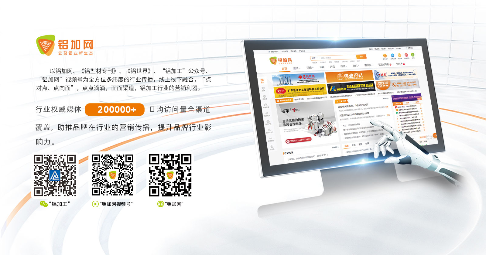 鋁加網(wǎng)(www.albiz.cn)是聞名鋁加工行業(yè)的垂直門(mén)戶(hù)網(wǎng)站,云聚鋁業(yè)新生態(tài),構(gòu)建鋁業(yè)新場(chǎng)景,以albiz.cn 網(wǎng)站為核心,以移動(dòng)云端、鋁加工微信、鋁加網(wǎng)視頻號(hào)、《鋁型材專(zhuān)刊》和《鋁世界》雜志為載體,成為了鋁加工行業(yè)資訊和精準(zhǔn)傳播的首選傳媒。鋁加網(wǎng),采集和發(fā)布全行業(yè)信息資訊,提供線(xiàn)上展覽、在線(xiàn)直播、短視頻、品牌策劃、品牌運(yùn)營(yíng)、品牌傳播等全方位的專(zhuān)業(yè)服務(wù)。